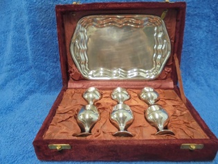 EPNS hopeoidut liköörilasit 6 kpl ja tarjotin rasiassa, vintage, A40070.00 €